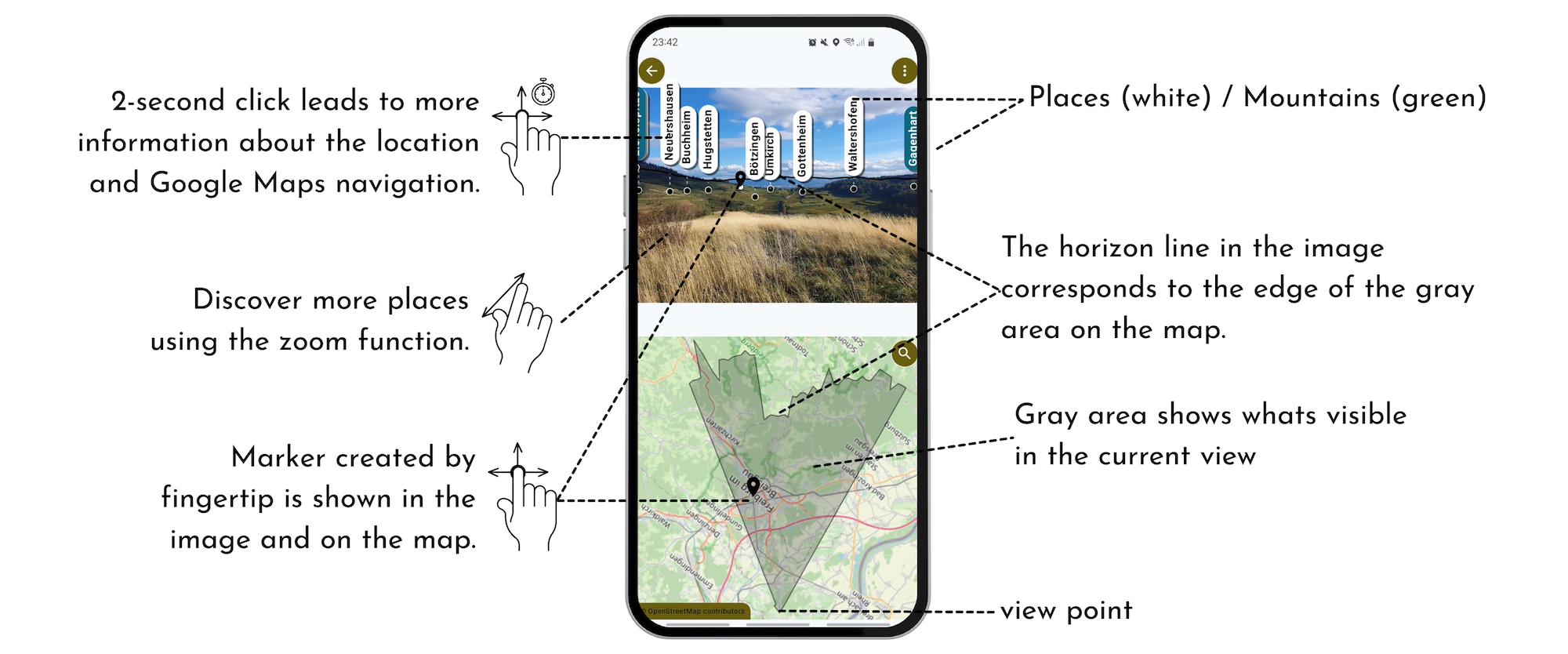 In addition to mountains and places, we also integrate exactly the points that are relevant to you upon request (e.g. sights, town hall, lake, etc.).